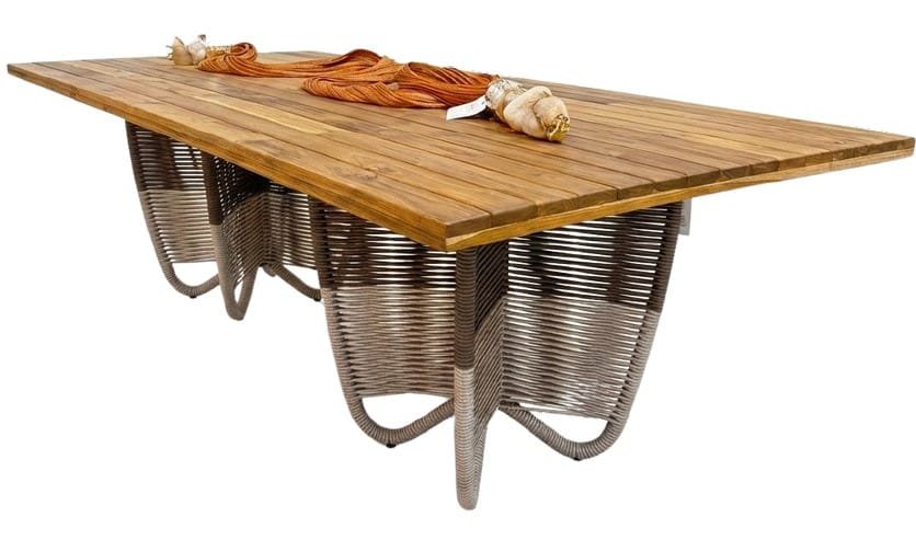 Mesa Pêdala com estrutura em alumínio, tampo em madeira Teca e base em corda náutica, unindo resistência, durabilidade e um design elegante que valoriza o ambiente.