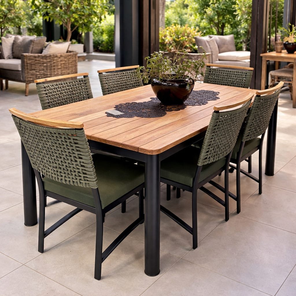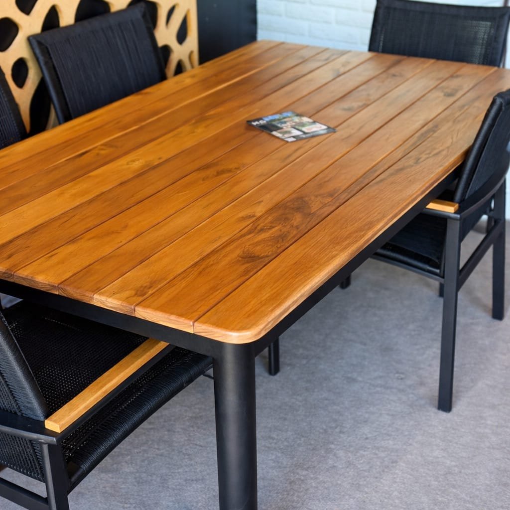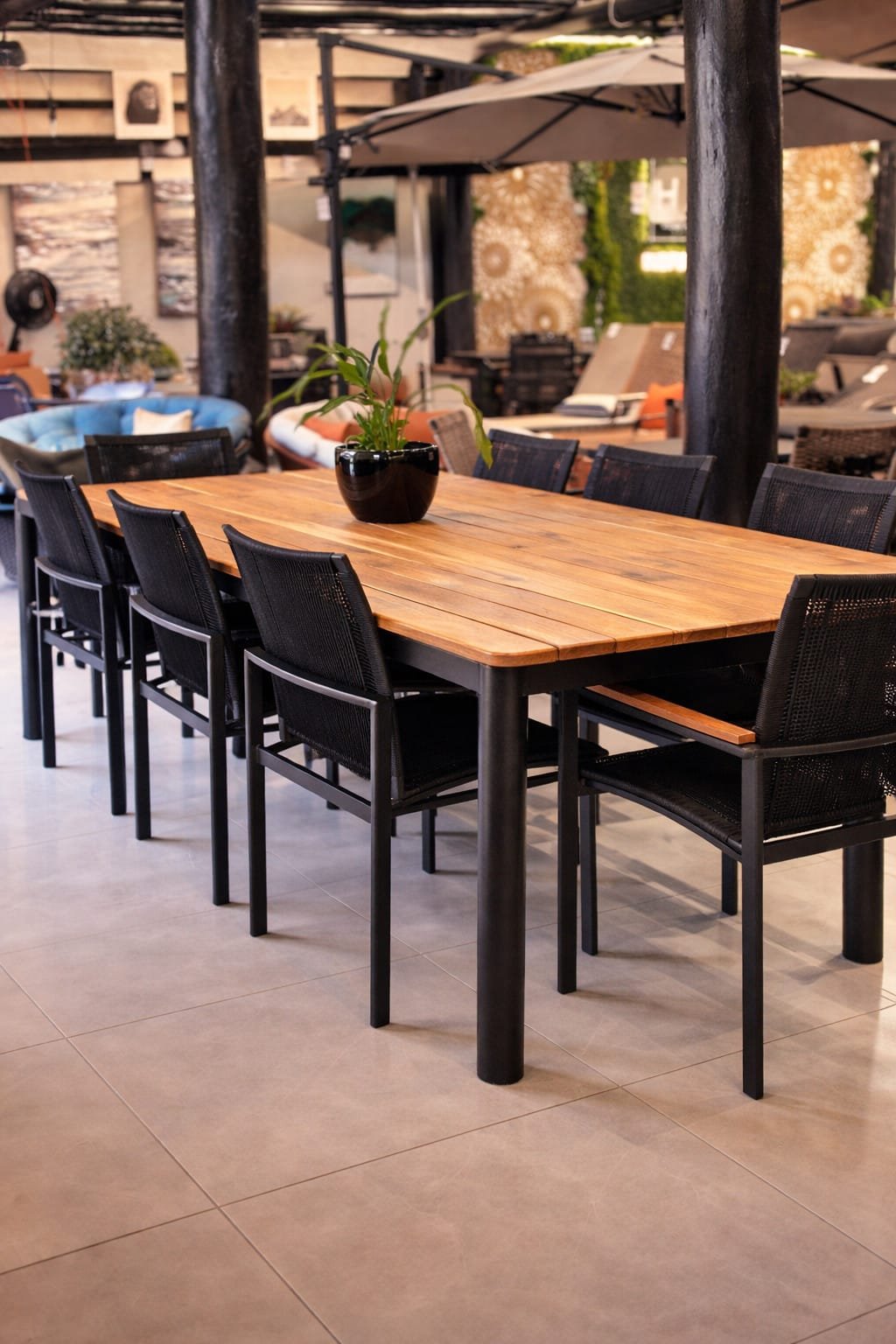 A Mesa Vértice é a escolha perfeita para quem busca elegância, resistência e personalização. Seu tampo em madeira teca traz um visual sofisticado e natural, com alta durabilidade e resistência às intempéries. A estrutura em alumínio com pintura eletrostática garante leveza, robustez e proteção contra corrosão.